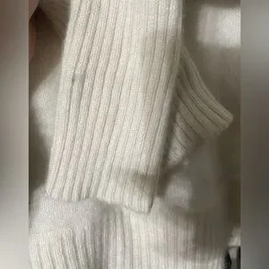 Extremely soft cozy sweater. It looks beautiful on, the pics are not very flattering. It has a repair on the back side and a small spot on the sleeve.