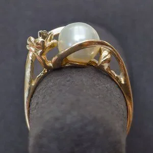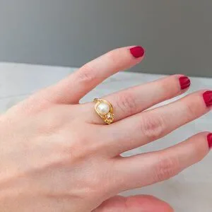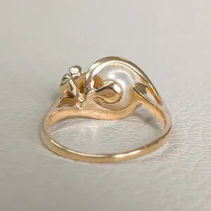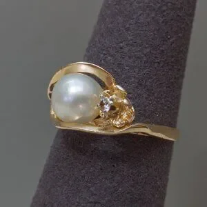 Keywords: 14k gold ring, yellow gold ring, pearl ring, cultured pearl ring, pearl diamond ring, swirl ring, bypass ring, vintage pearl ring, diamond accent ring, floral gold ring, size 5.75 ring, estate jewelry, fine gold jewelry