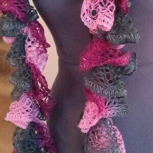 Very unique, long scarf in great condition! 2 different shades of pink, dark green, and weaved in sparkle strands make this scarf very fashionable!