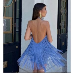 This is the viral Zara blue fringe dress NWT! Note two issues 1- the button for closure around the neck is missing (but can easily be replaced) and 2- the fringes are a tangled mess. They will untangle fine, I just don't have the patience to do it myself. OTHER than those two things, the dress is perfect. This dress sold out immediately when it came out years ago and often sells for higher than retail so this is a steal!