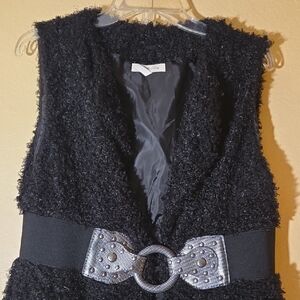 Chic black fuzzy vest. Features a stylish silver buckle. Perfect for layering.