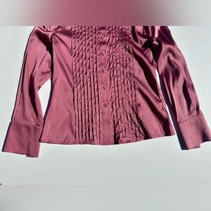 St. John Silk Satin Elegant Pink Mauve Button Up Blouse, Pleated, Stitching, 4