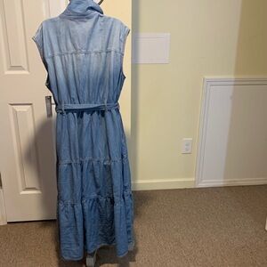 Stylish denim midi dress with a tie belt. Sleeveless design for a casual look.