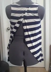 Sleeveless, navy and off white striped, summer shirt. Back layers over each other and is open. Sides are longer.
