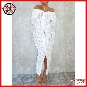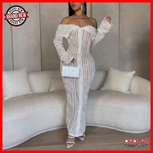 Brand new and in flawless condition — this stunning off shoulder maxi dress delivers a sexy, elevated look perfect for evenings out, special events, or making a statement. The bodycon fit is sleek and flattering, while the see-through details add a touch of allure.