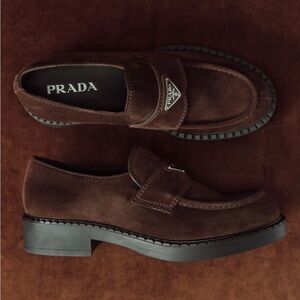 Women's Prada Brown Suede Platform Loafers with Triangle Logo 🥿