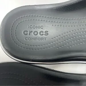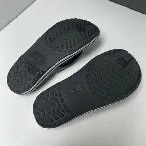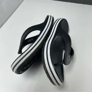Comfortable black flip flops by Crocs. Features a sleek design with white accents.