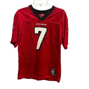 The product is a vintage Reebok Players Inc Falcons Michael Vick 7 jersey in youth size XL, featuring the official team colors of red. It is officially licensed by the National Football League (NFL) and indicates the event/tournament as the regular season. Made in China, this jersey represents the Atlanta Falcons and is ideal for fans of football, specifically Michael Vick, looking to show their support in style.