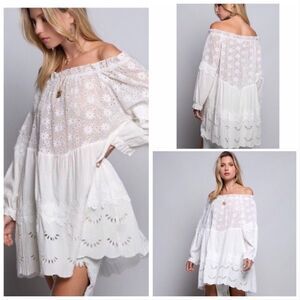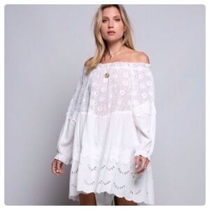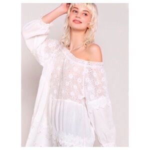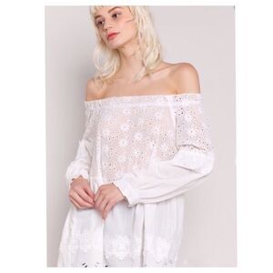 white Off Shoulder Tunic w Lace Trim & 3/4 Sleeves