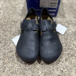 Birkenstock London black oiled leather shoes in size 43 (men's 10). These comfort shoes feature a solid black color with a buckle closure, flat heel style, and regular shoe width. The unisex adults' shoes are designed for casual wear and are perfect for everyday activities. Made by the reputable brand Birkenstock, these shoes offer both style and comfort for the wearer.