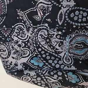 It features a bold paisley design in shades of black, purple, blue, and white. The inside lining is different, showing a plaid/tartan pattern in beige, red, and black tones.