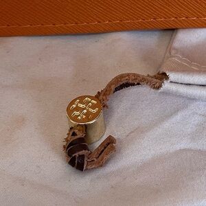 This pretty orange sunglass case from Tory Burch is in excellent, like new condition and also includes a light gray cloth bag with gold logo hardware.