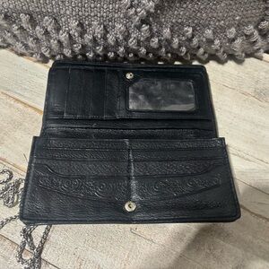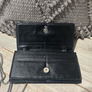 2 slip, holds 14 cards, ID window, magnetic snap close. Back zip change purse. Silver detachable chain strap.