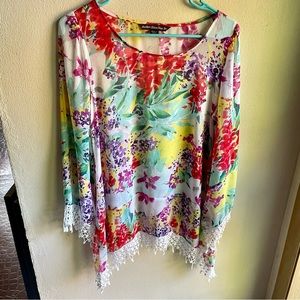 Sienna Rose Bohemian Floral Tunic/ Swim Cover-up. Bold Floral Print in red, yellow, green, purple on white background. Lace at cuffs and hemline. Long Flowy sleeves. This would be great for a tropical Vacation to wear to the beach or around the pool.