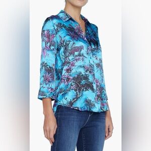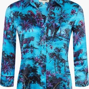 Vibrant button down shirt with exotic print. Features a mix of blue and purple hues. Perfect for a bold look.