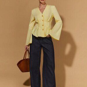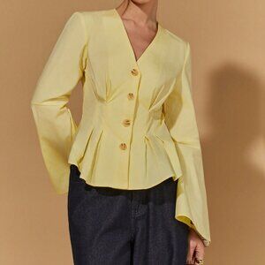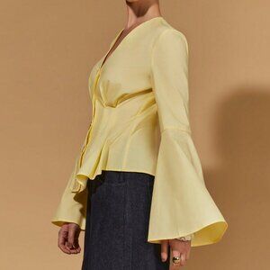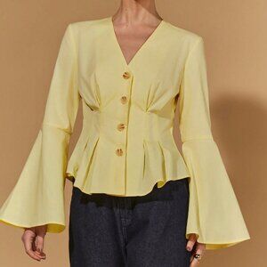 Add a sunny touch to any outfit with this light yellow blouse, showcasing a deep V‑neck and eye‑catching flare sleeves. Designed with a regular fit and a flared hem, the piece offers a balanced silhouette that drapes gracefully at a regular length. The subtle contrast of the bright hue and classic details makes it versatile for workdays, brunches or evening gatherings.