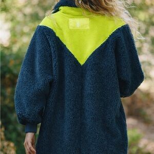 Stay cozy and stylish with this vibrant blue and neon green fleece jacket. Perfect for chilly days, this jacket offers warmth and a pop of color to your wardrobe.