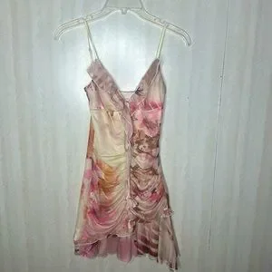 Stylish mini dress with a tie-front design. Features a pink and cream pattern.