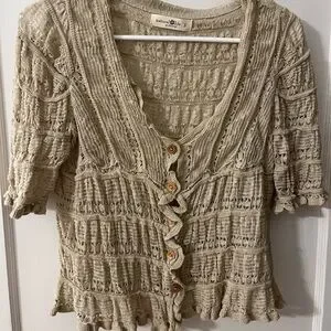Chic knit blouse with ruffle details. Button-up front. Perfect for layering.