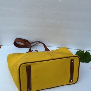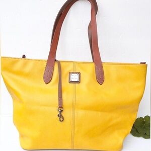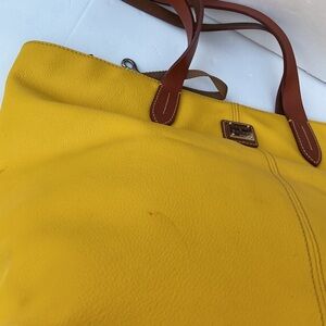 Dooney and Bourke large tote bag in yellow pebble leather, used only a couple of times but it comes with light stains caused by the darker color straps touching the yellow leather, sold as is smoke and pet free. Retails over $450
