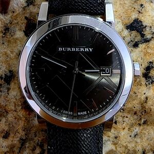 Elegant Burberry watch with a silver face and black leather strap. Stylish and sophisticated design. This watch appears to be flawless and worn just a couple times based on lack of flaws and the band condition. Im not sure one could buy a better pre-owned version on this.