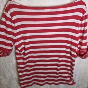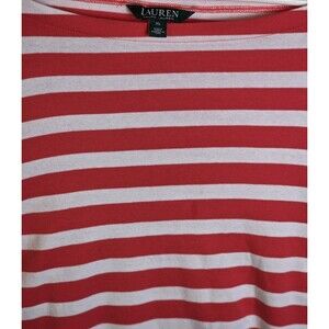 The Lauren Ralph Women's XL Shirt is a stylish and versatile top perfect for various occasions like travel, parties, or casual outings. Made from a blend of elasth and cotton, this lightweight shirt features a red striped pattern with embroidered accents, giving it a preppy and trendy look. The crew neck and pullover closure make it easy to wear, while the short sleeves and regular fit ensure comfort. Machine washable and suitable for all seasons, this T-shirt from the renowned Lauren Ralph Lauren brand is a must-have for any fashion-forward woman's wardrobe.