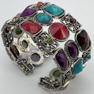 Vintage Colorful Silver Tone Wide Open Cuff Bracelet Rhinestone Statement Boho