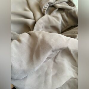This is a fit-and-flare midi dress with a thigh slit, a sweetheart neckline and voluminous sleeves. It's made from drapey, recycled fabric with subtle sheen.