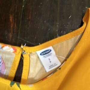 Old navy, yellow flowered, mini dress. dark yellow with flowered print. Long sleeve with bow ties at wrist.keyhole opening in back. Gently preloved condition. Rayon. size small