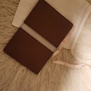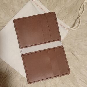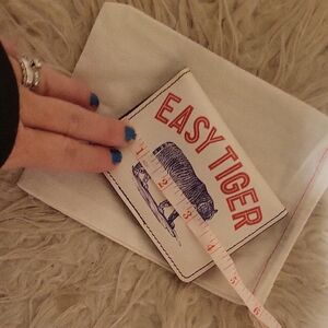 White card holder with 'Easy Tiger' design in red and blue. Comes with a drawstring pouch. Brand new from Etsy. Just too small for my use. Leather.