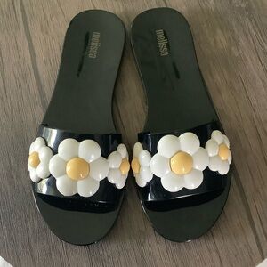 Melissa Black Sandals Flats with White and Yellow Floral Design