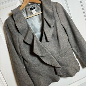 Elevated and feminine J.Crew wool blazer in a classic heather gray. Features a dramatic cascading ruffle front with intentional raw edges, a soft peplum-style hem, and a tailored silhouette. Fully lined for comfort and structure.