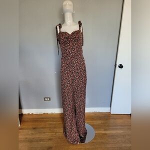 Ditsy floral wide leg jumpsuit with tie straps, gathering at bust, and back zip.