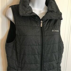 Women's Columbia Brand Dark Charcoal Gray Zip Up Fleece Lined Quilted Puffer Vest with pockets size medium in excellent pre-owned condition.