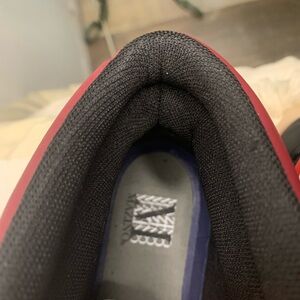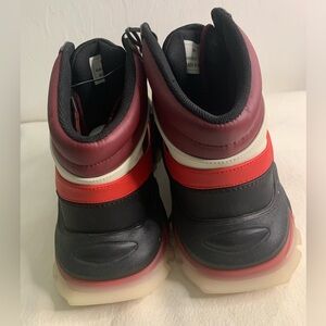 Stylish Mazino high-top sneakers in red and black with a unique pattern.