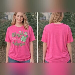 Embrace a playful style with the Pink Shamrock Tee. This vibrant pink top features a charming shamrock design, perfect for casual outings.