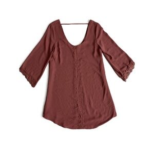 Features: 3/4 Sleeve, Scoop Neck, Lace Trim, Rust Color, Boho Style