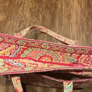 Has a large outside pocket in a small pocket on the other side. Zip enclosure with two small pockets inside. No rips. See picture for small stains on the outside.