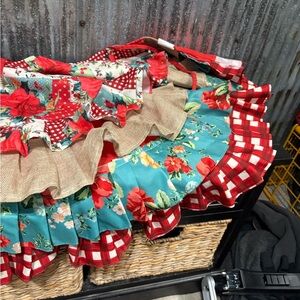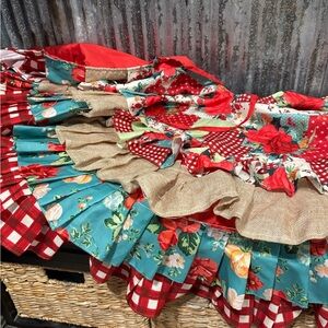 RETIRED The Pioneer Woman 48" 4-Tier Linen Ruffle Christmas Tree Skirt Multicolor Red and White Gingham Blue with Flower / Floral Pattern Burlap Patchwork Country Rustic look Measures 48" in diameter Tie Closure
