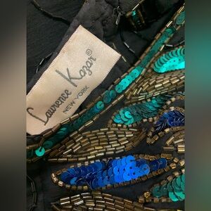 Vintage Beaded Dress Sequin Peacock, 100% Silk Cocktail Mini Size Petite Large by Lawrence Kazar estimated late 1970’s - early 80’s. This gown is well made with intricate detail in sequins and beads. Featuring a zipper closure, short sleeve, rounded open back, fully lined with a little bit of stretch. In excellent condition clean without any noticeable flaws. Please check the measurements in the pictures to get a better idea if this might fit you. Thank you for looking!