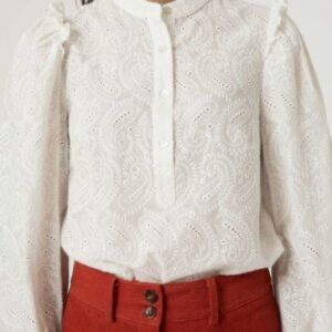 Fall for the deliciously retro look of the Clyde shirt. This vintage style top combines a paisley embroidery with ruffles on the shoulders and smocked sleeves. We also like its Mao collar extended by a buttoned fastening. A feminine and easy-going top which will quickly become an essential in your wardrobe.