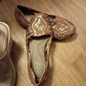Explore elegance with these stylish women's sandals. these are size 7 first pair or leather Dockers, second pair natural soul all through comfort, one pair of ankle strap wedges universal thread micro suede when heel.