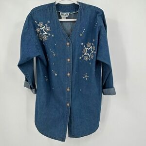 Vintage denim shirt jacket featuring star and floral embellishments with an easy XL fit, perfect for western, boho, and Americana layering.