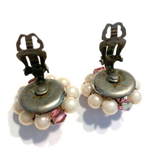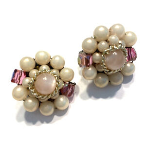 Vintage Mid Century Clip On Earring Pink Purple Faux Pearl Clusters Marked Japan