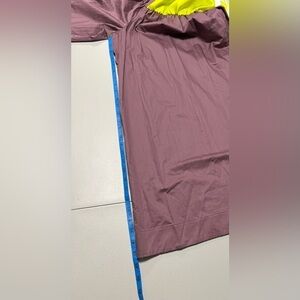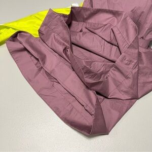 Dusty plum cotton poplin jumpsuit from Tibi featuring a deep V neck, belted waist and side slit pockets. In an all-over colourblock pattern, the jumpsuit has wide legs and a gathered ruched waist.