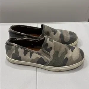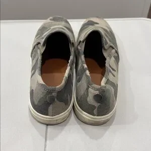 Express slip-on shoes with a green and gray camo pattern. Easy to wear and stylish.
