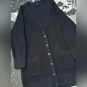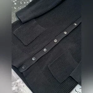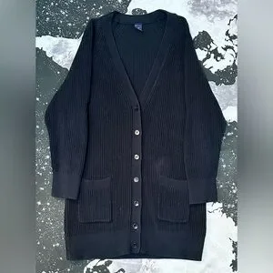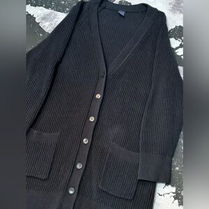 Gap Women’s Shaker Stitch thick heavy ribbed knit style cardigan sweater, color is black with front pockets & button closure.