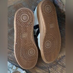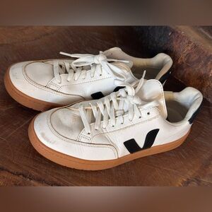 Elevate your look with Veja sneakers. Crisp white leather with bold black accents. Durable brown soles for everyday wear.