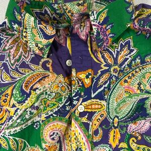 Polo Ralph Lauren women’s long sleeve button-down shirt in a vibrant multicolor paisley pattern featuring green, purple, yellow, and orange tones. Designed with a collared neckline and Custom Fit for a polished yet comfortable look. Perfect for workwear, casual outfits, or layered styling. Missing one button on sleeve.