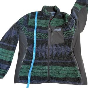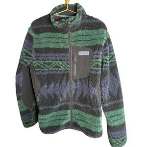 This Full Zip Sherpa jacket does not have a size tag but I believe it's a men's medium. Please see pics with measurements to ensure a great fit. It will ship quickly from a smoke free home.